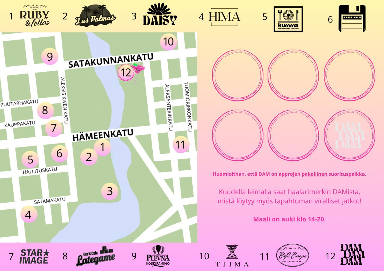 The Mocktail-appro takes its participants to tour the best drink spots in the city center. Collect 6 stamps from different appro places and in return you get an Mocktail-appro overall badge. The event is organized by TamAus ry.